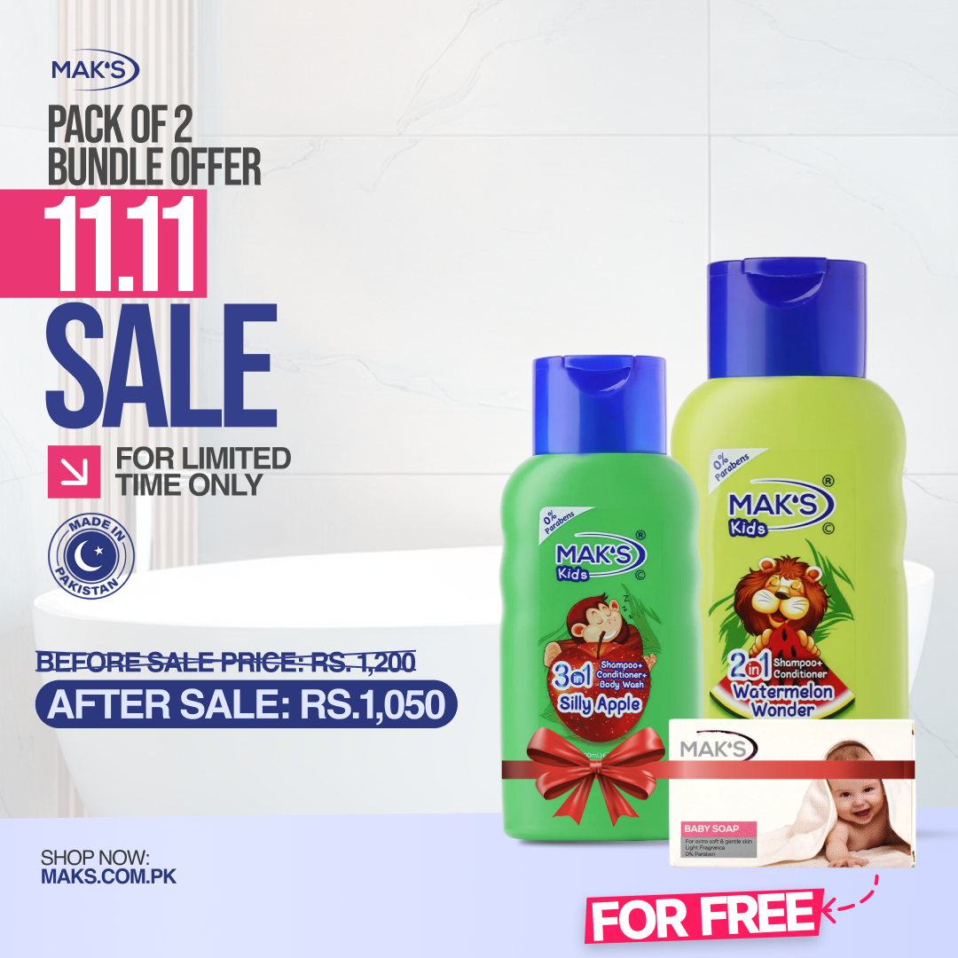 Enjoy the MAK’S Kids 3-in-1 Shampoo + Conditioner & 2-in-1 Pack of 2 in Apple and Watermelon — specially formulated to be gentle, tear-free, and paraben-free.