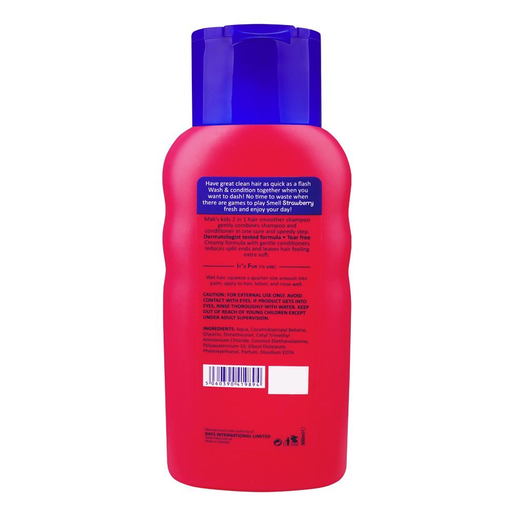 Mak’s Kids Strawberry 2 in 1 shampoo and conditioner combines shampoo and conditioner in one quick step, perfect for kids who can’t sit still! This kids' shampoo and conditioner has been made with an ophthalmologist-tested formula to make sure your child has an enjoyable, tear free experience. Mak’s shampoo 2 in 1 for kids refreshes hair and doesn’t leave any residue after washing. This kids' shampoo and conditioner help to reduce split ends and tangles, giving your kids soft, easy-to-manage hair.