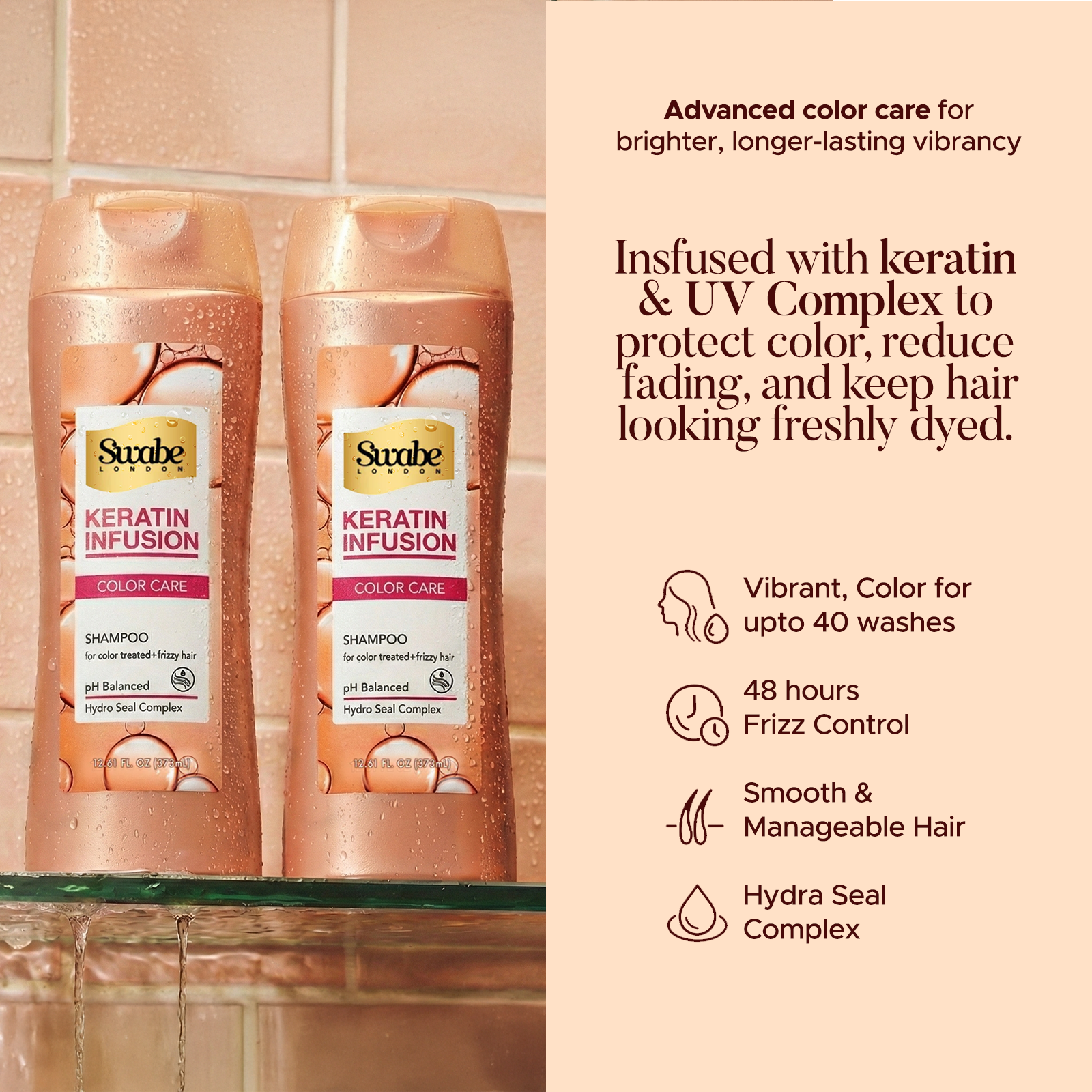 Protect your hair color while keeping frizz under control with Swabe Infusion Color Care Shampoo. Specially formulated for dyed or chemically treated hair, it gently cleanses without stripping color. The Hydro Seal Complex locks in moisture, boosts shine, and keeps your color vibrant for longer.
