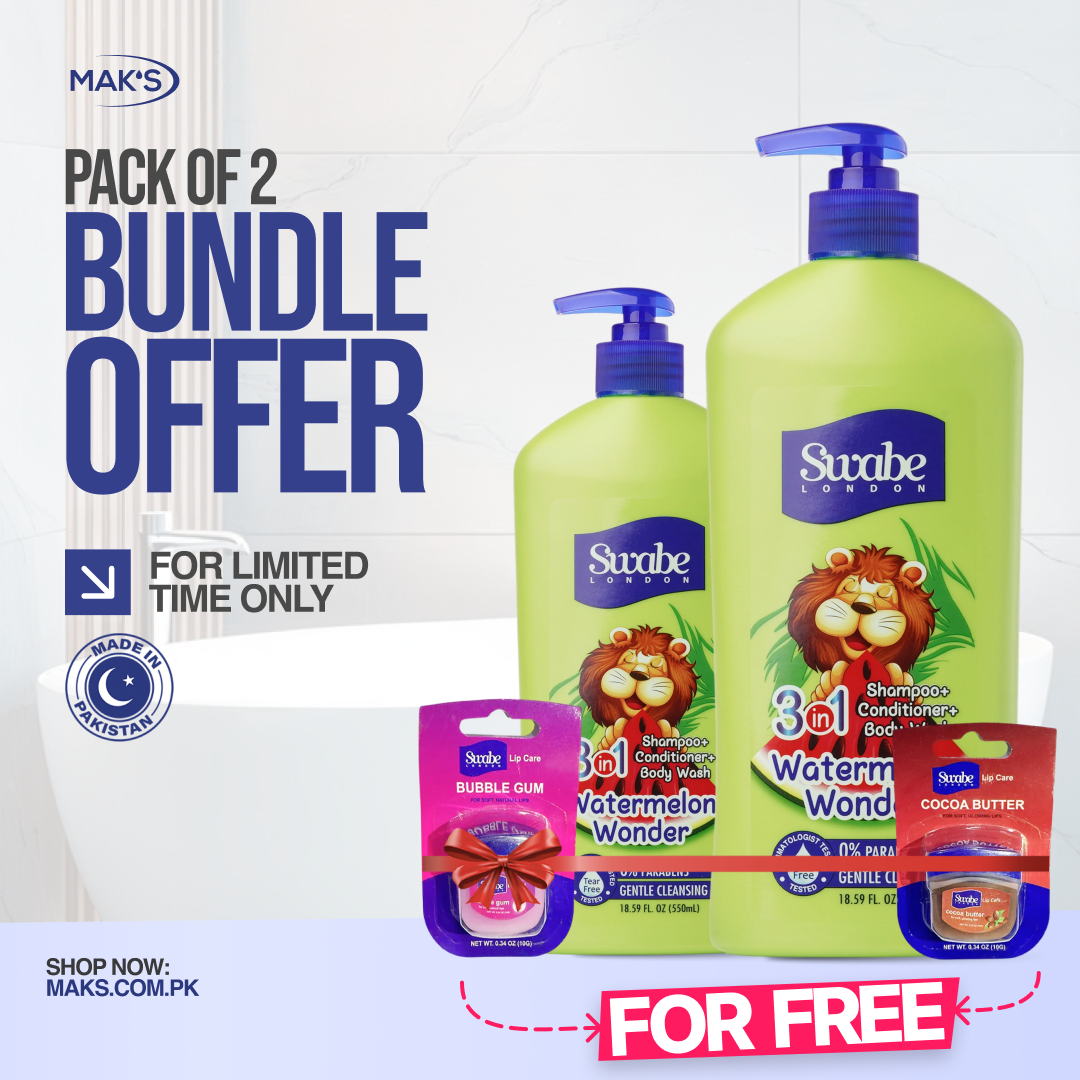 Upgrade your family’s bath-time routine with our exclusive Swabe London Watermelon Wonder 3-in-1 Bundle! This special Pack of 2 includes two full-size 3-in-1 bottles (Shampoo + Conditioner + Body Wash), perfect for gentle cleansing with a refreshing watermelon scent kids love.